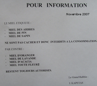 de Bné Brak tendant à interdire ce miel.Nous venons de découvrir un avertissement en ce sens publié par le Rav Kapétas de la Synagogue de Vincennes, établissant que le miel d'arbres, le miel de pin et le miel de sapin ne sont pas cachers, et que par contre les miels d'oranger, de lavande, d'acacias, et le miel "toutes fleurs" restent autorisés. |