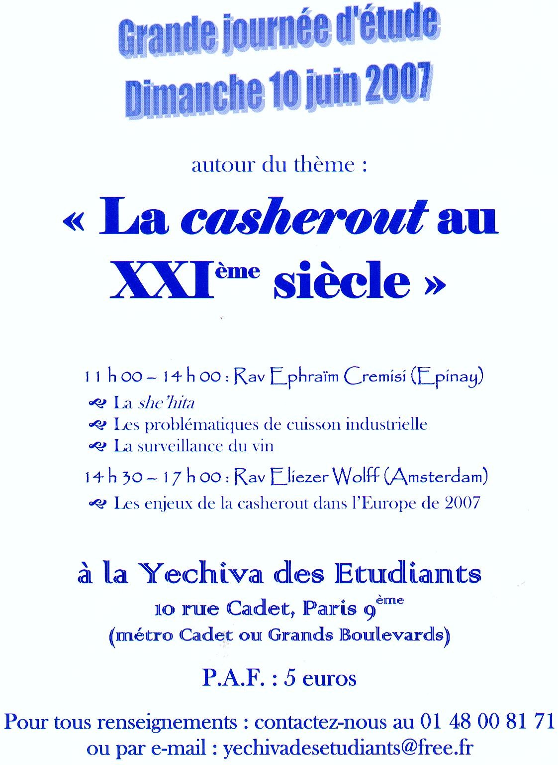 cacherouth au XXI ème siècle" Journée d'étude le Dimanche 10 juin la Yéchiva des Etudiants, 10 rue Cadet. Avec Rav Cremisi (Epinay) et Rav Wolf (Amsterdam). |