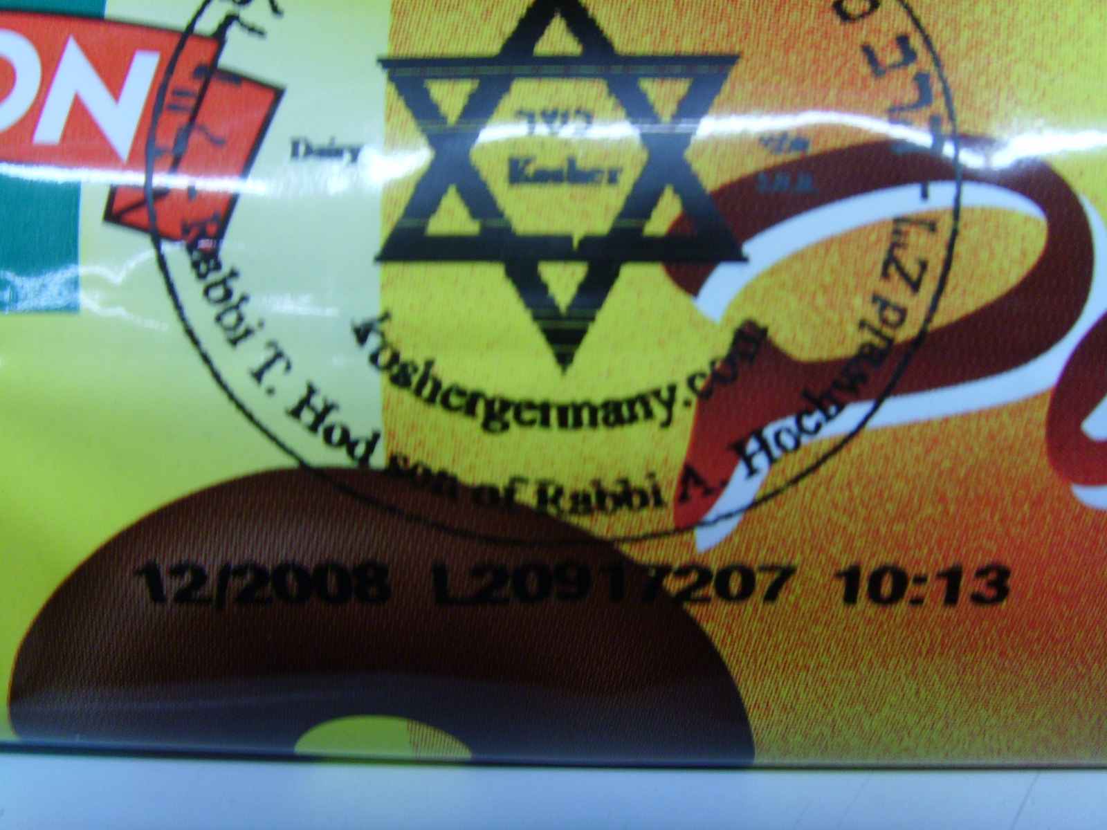 dégainent leur appareil (tu se souviens, Mme B ?). L'objet de ces lignes est la miniaturisation des étiquettes de cacherouth, parfois fort gênante. Ainsi, une gamme de gâteaux au lait du Rabbin Hod arbore une étiquette où le mot "dairy" [au fait, pourquoi pas en français?] mesure un demi millimètre de hauteur. Nous re-interrogeons à ce sujet le Rabbin Hod qui n'a pas donné suite à notre courrier de novembre 2006. Mais il est battu par les produits de la gamme Ethnic Delight, qui sous prétexte d'une petite taille des pots de ses délices, nous honore d'une étiquette de cacherouth du Rav Schlesinger de Strasbourg et d'une étiquette du Rav Rosenzweig de Even Yehouda qui mesurent 8mm pour l'une et 4.5 mm pour l'autre, avec des caractères assurément moins que 0.5 mm de hauteur. C'est une façon comme une autre de considérer le consommateur, qui pourrait rester anecdotique, sinon le fait que cette gamme était sur-représentée dans les rayons "cachers" d'un hyper marché de la région parisienne la veille de Pessa'h 5767, et que l'acheteur lambda ne pouvait lire "Cacher le Pessa'h" lorsque cela y figurait, ni "Cacher sauf à Pessa'h" lorsque cela y figurait en hébreu. Ou bien sûr le distributeur n'y est pour rien, c'est l'acheteur de la chaîne qui fait les courses. Mais quelle candeur a du avoir le commercial lorsqu'il a vu passer une telle commande à l'approche de Pessa'h! Nous avions interrogé sans succès le distributeur en juin 2005… mais remettons le travail sur l'écheveau. |