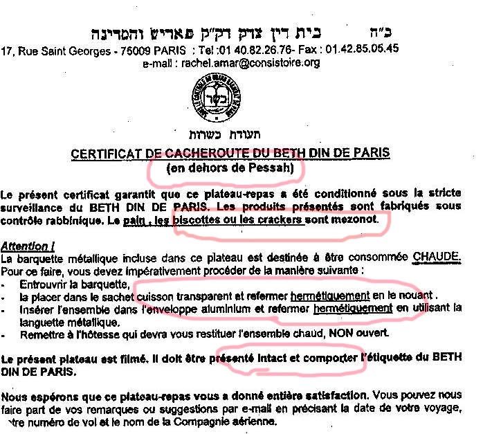 des avions. Nous sommes donc obligés de faire avec ce que l'on a, en attendant d'heureuses initiatives de la part de nos lecteurs, souvent professionnels de l'alimentation cachère. Et quand nous sommes contents, nous le disons. Ainsi un de nos enquêteurs a pu se faire servir un plateau sous la surveillance du Beth Din de Paris, qui -oh surprise!- était accompagné d'une notice en hébreu, français et anglais, sur laquelle était précisé que le plateau est cacher à l'exception de Pessa'h, qu'il doit être présenté sous son emballage, lequel porte une étiquette inamovible, que le pain est "mezonot", ce qu'il faut faire pour le faire chauffer tout en le conservant dans sa condition de plat cacher. Au retour, mauvaise surprise, un plateau non conditionné sous surveillance rabbinique, contenant divers produits les uns sous surveillance, les autres sans surveillance, certainement des produits figurant dans la liste du Beth Din, mais le voyageur lambda n'est pas supposé se déplacer avec les documents qui pourraient le convaincre de la nature cacher prétendument alléguée par le traiteur de la compagnie. |