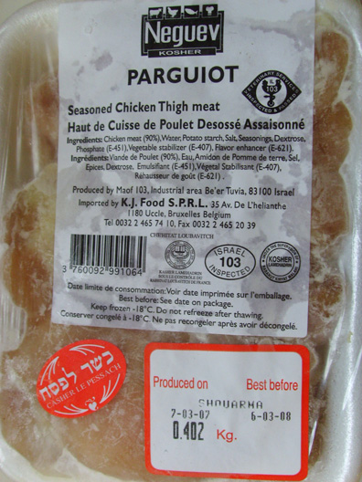 congelées. Ces produits, dont certains préparés en Novembre 2006 avec une validité surprenante de deux ans pour de la volaille importée d'Israël, sont estampillés "Cacher le Pessa'h" mais contiennent du dextrose, un dérivé d'hydrolysat d'amidon, qui ne saurait être Cacher le Pessa'h, d'autant que les abattoirs israéliens commencent rarement à travailler pour Pessa'h en Novembre. Nous interrogeons une nouvelle fois le Rabbinat. |