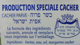 Mais d'autres gags peuvent aussi se présenter: Ainsi dans un magasin Carrefour de la Région Parisienne, majoritairement achalandé en produits de Yarden on trouve côte à côte des matsot Rozinski Cacher pour Pessa'h et des Matsot non garanties Cacher pour Pessa'h. |