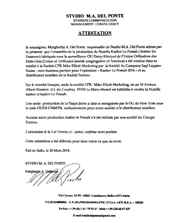 une attestation de Mr Menahem BenDayan, le vendeur,