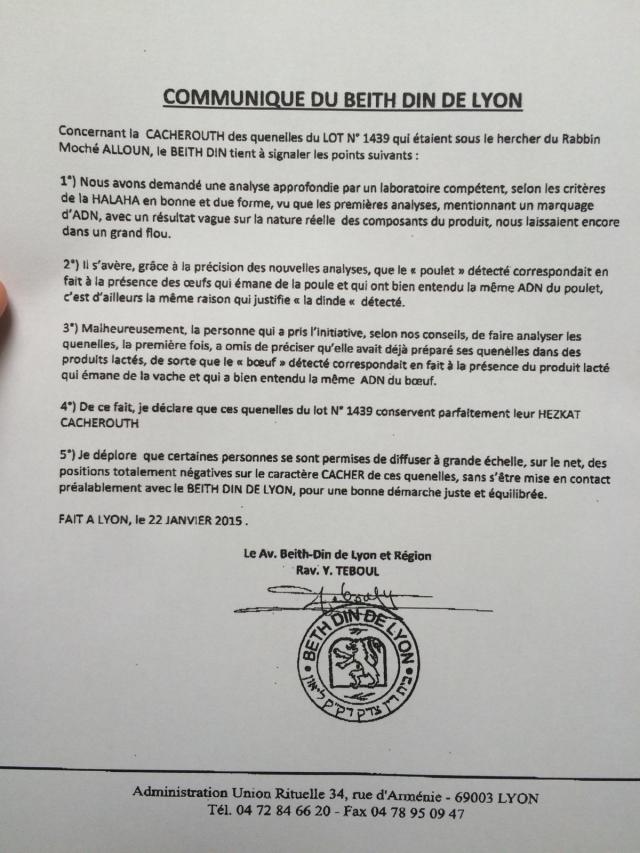 patrimoine français est bien défendu. (25 Février 2015) Suite à l'histoire des quenelles de janvier 2015, nous avons écrit au producteur, la Maison Desmaris, "Entreprise du Patrimoine Vivant" pour comprendre en quoi la présence d'œufs de poule pouvait faussement positiver la recherche d'ADN de dinde. Mr Desmaris, auteur de cette allégation dans un courrier du 14 janvier (http://www.kacher.fr/Desmaris20150122.pdf), a bien voulu nous répondre enfin, "Je viens d’avoir le Rabin Alloun au téléphone Je n’ai pas à vous répondre ni à vous lire Merci de vous adresser directement au Rabin Alloun Cordialement" Nous avions estimé (http://www.kacher.fr/ActuK2015.htm#quenelles20150107) que le courrier dudit sieur du 14 janvier était loin d'être spontané et que " nul doute que les termes en ont été écrits à la demande de A.". Le nouveau courrier de Mr D semble directement sorti de la bouche du "rabbin". Un tel refus d'explication semble navrant de la part d'un dirigeant d'entreprise. Si un lecteur peut obtenir réponse, demandez lui aussi pourquoi les quenelles "quicontiennent30%d'œufs" n'ont plus trace d'ADN de poulets ni d'œufs sur la contre analyse effectuée par le "rabbin". Nous ne laisserons pas ces quenelles finir en eau de boudin. |