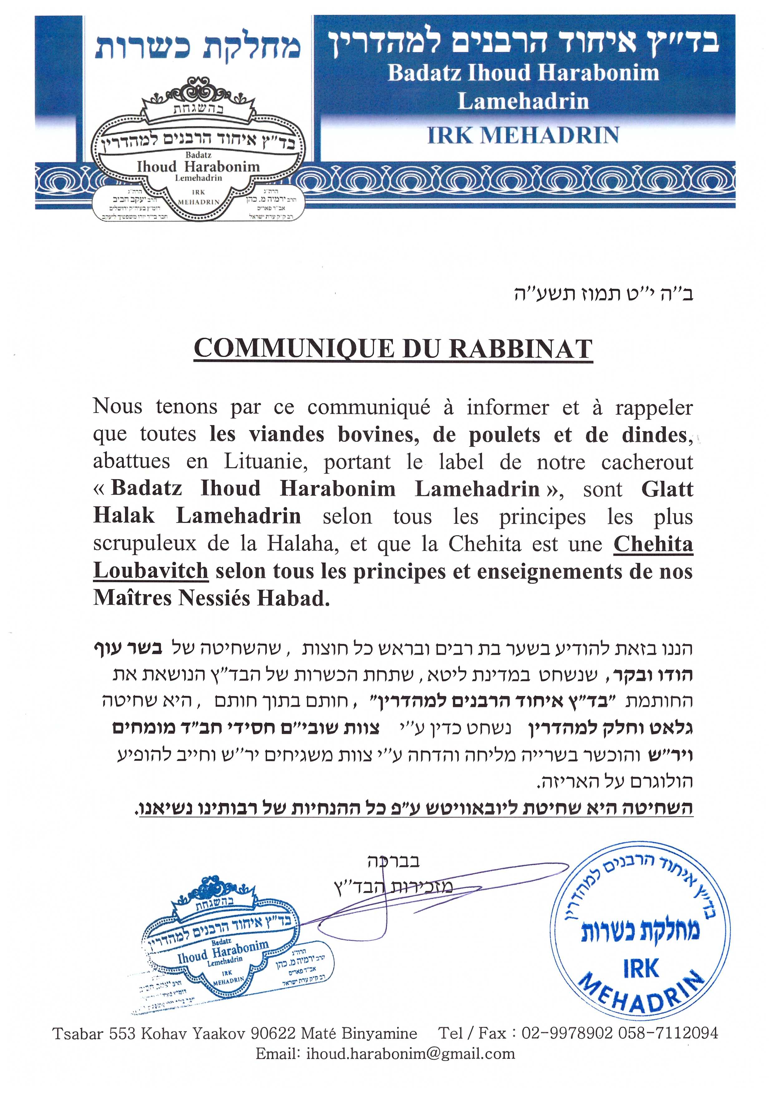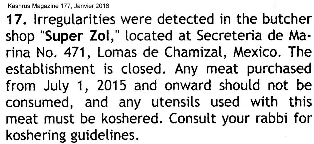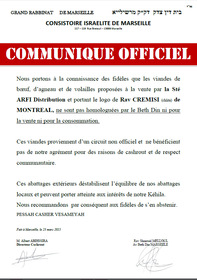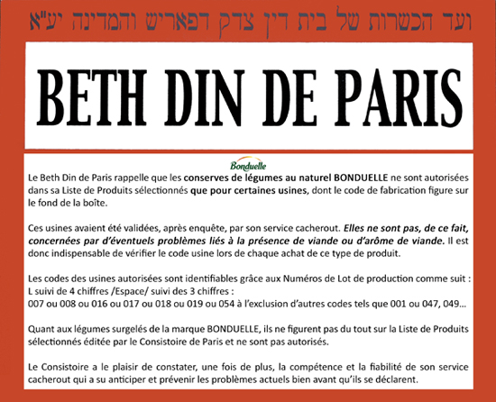 bonne vache, c'est le consommateur... Un correspondant nous a fait parvenir une vidéo diffusée sur le site Facebook " Tous les certificats Kasher" https://www.facebook.com/100009509870291/ videos/1504253889901592/ (http://www.kacher.fr/LBV201510.mp4) qui dissèque une boite de fromages fondus "La Bonne vache" estampillée Nahalat Its'hak. Sous l'étiquette ronde de la boite, une autre étiquette de fromages fondus Netto, comme sur le ruban qui ferme la boite. A l'intérieur, 12 portions de fondus Netto. (... article entier) Rappelons quelques références quant à ce Rabbinat: http://www.kacher.fr/ActuK2012a.htm#concours2012a http://www.kacher.fr/ActuK2011a.htm#KL20110607 http://www.kacher.fr/ActuK2014.htm#NI2014psh http://www.kacher.fr/ActuK2011a.htm#anticip http://kacher.fr/NI5772a.htm http://www.kacher.fr/ActuK2011a.htm#k0 http://www.kacher.fr/ActuK2011a.htm#retoques Rappelons aussi que ce Rabbinat est dirigé par un Rav Ouriel Barguil (téléphone: http://www.kacher.fr/NI/thenobel.jpg), et se place sous la direction du Rav Eliahou Abergel qui ne proteste pas contre cette utilisation de son nom, voire s'abrite derrière la stature du Rav Kaddouri, qui ne peut plus protester contre cette utilisation de son nom. |