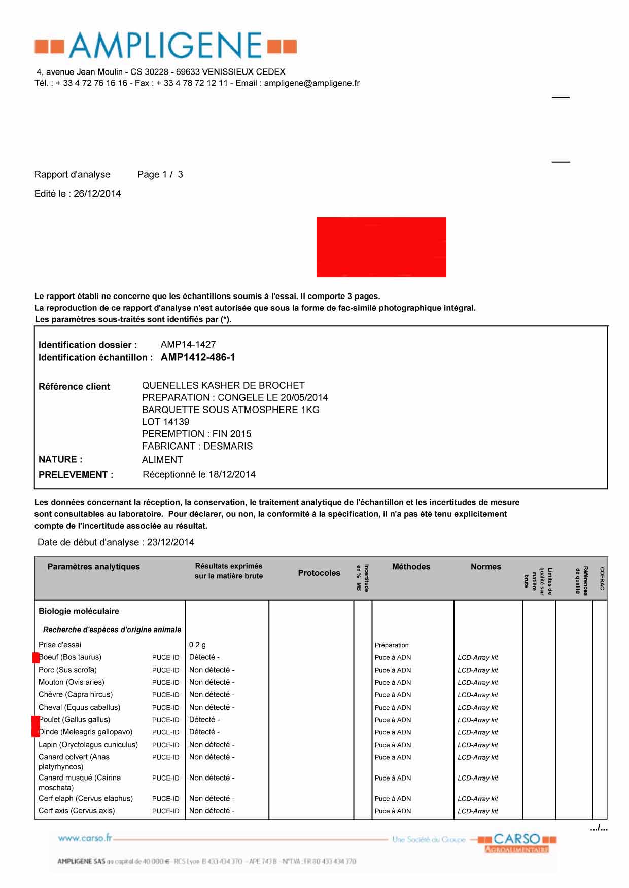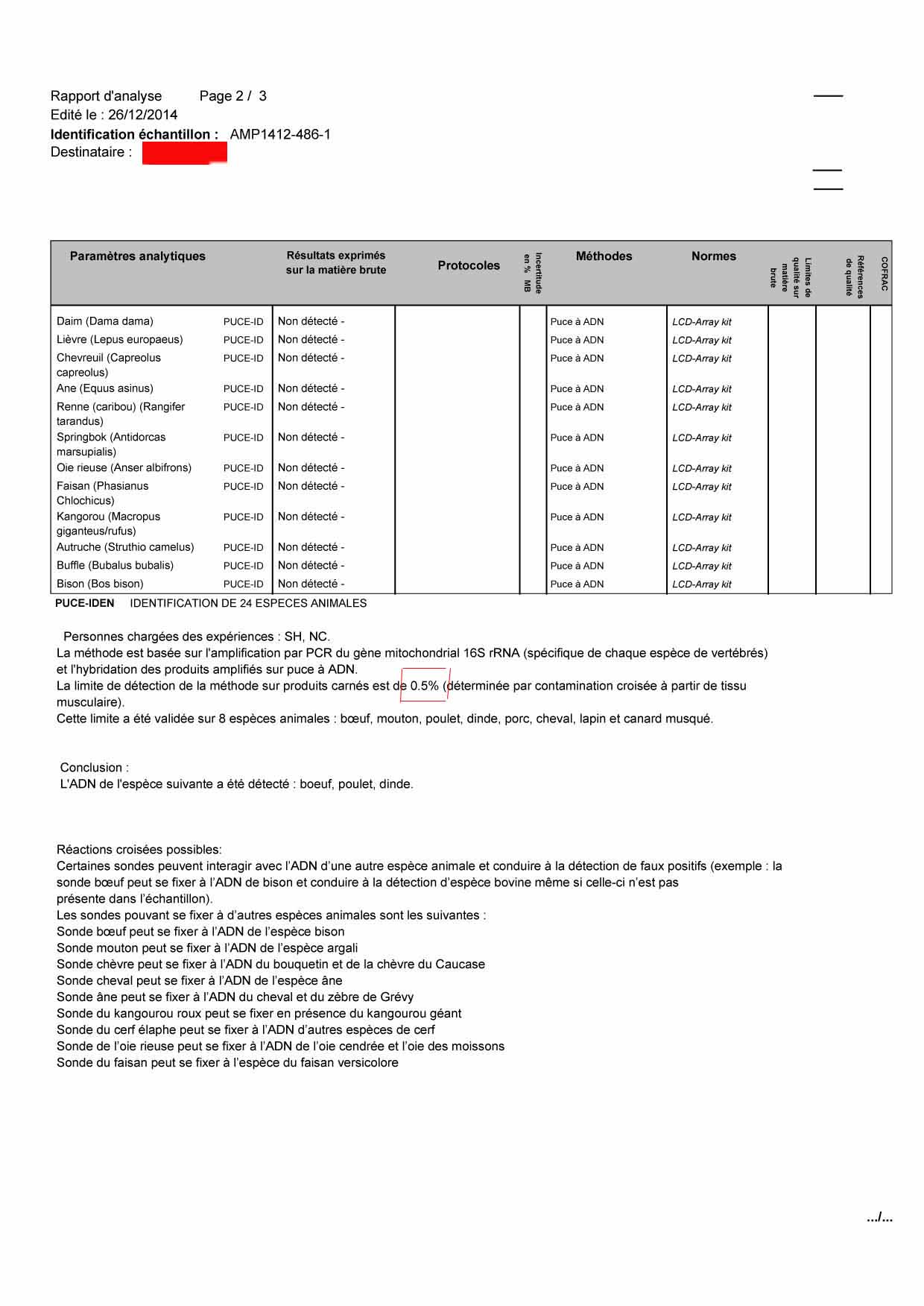 d'analyser. Autant pour nous. Il nous a également confirmé que d'autres analyses sont en cours, avec le Rabbi Teboul, et "nous manquerons pas d avertir les consommateurs". Voici les pages 1 et 2 de l'analyse ADN initiale. |