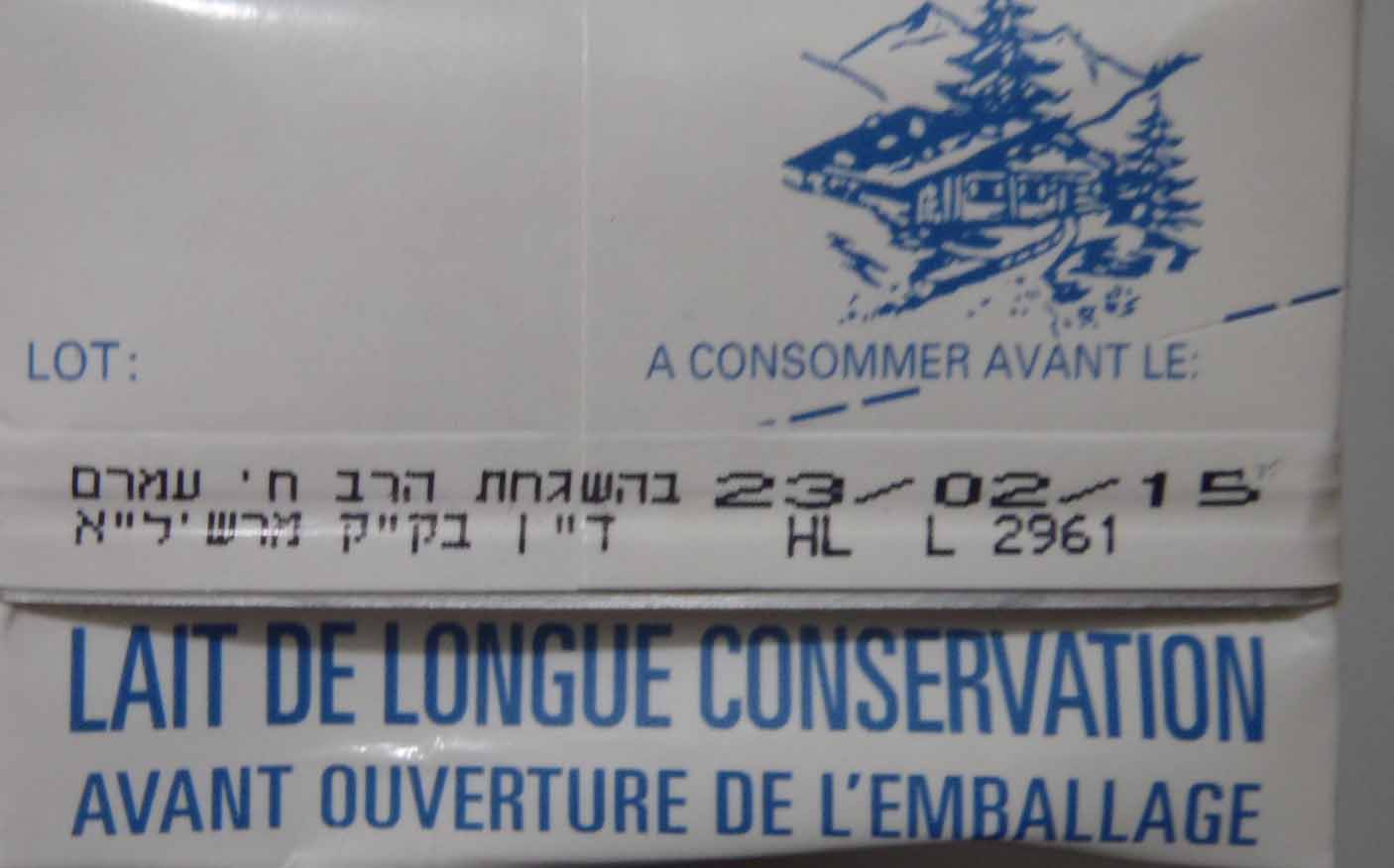 bilan d'activité 2014, voici une bonne nouvelle: le nouveau logo du Rav Amram Haï, Dayan à Marseille, ici apposé sur une production de lait surveillée depuis le début de la traite.. On notera que la marque "FleurAlpes" a disparu, laissant la place à un sobre SB, évoquant les initiales Simon Belhassen, fondateur de la maison. L'estampille sanitaire indique une production dans une installation précédemment utilisée par Fleur Alpes. L'emballage est également daté et marqué à l'encre. |