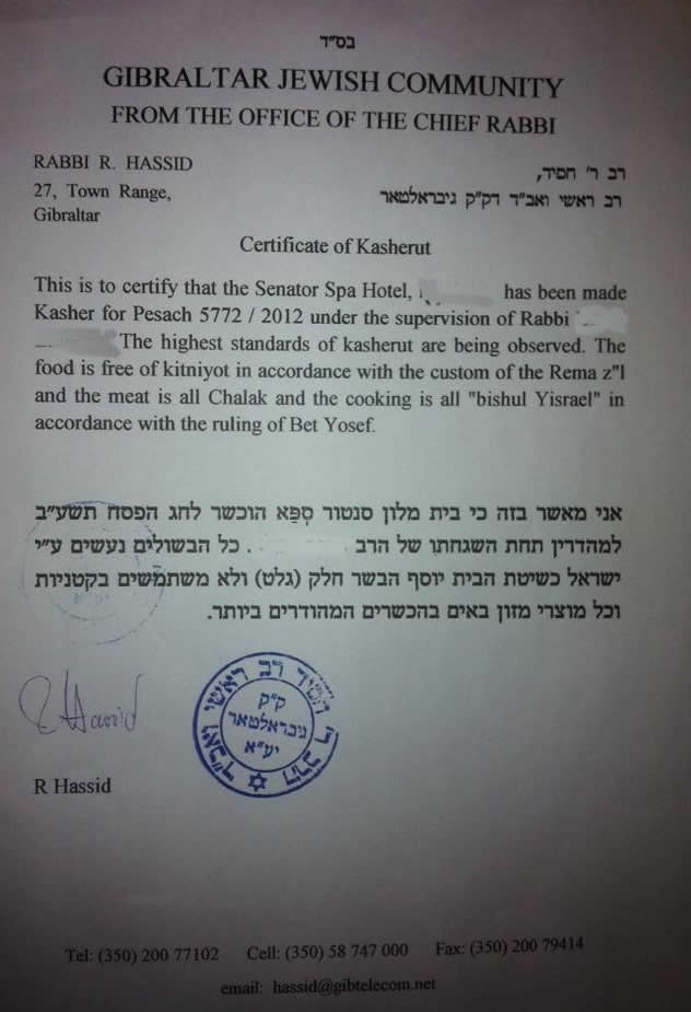 standards de cacherouth y sont respectés. Soit. Mais qui connait le Rav Z ? Qui nous dit que la surveillance effective durant Pessa'h est effectuée par le Rav Z? Et pourquoi ce Rabbinat n'utilise-t-il pas la formule usuelle "nous certifions que l'hôtel X est sous NOTRE surveillance" ? |