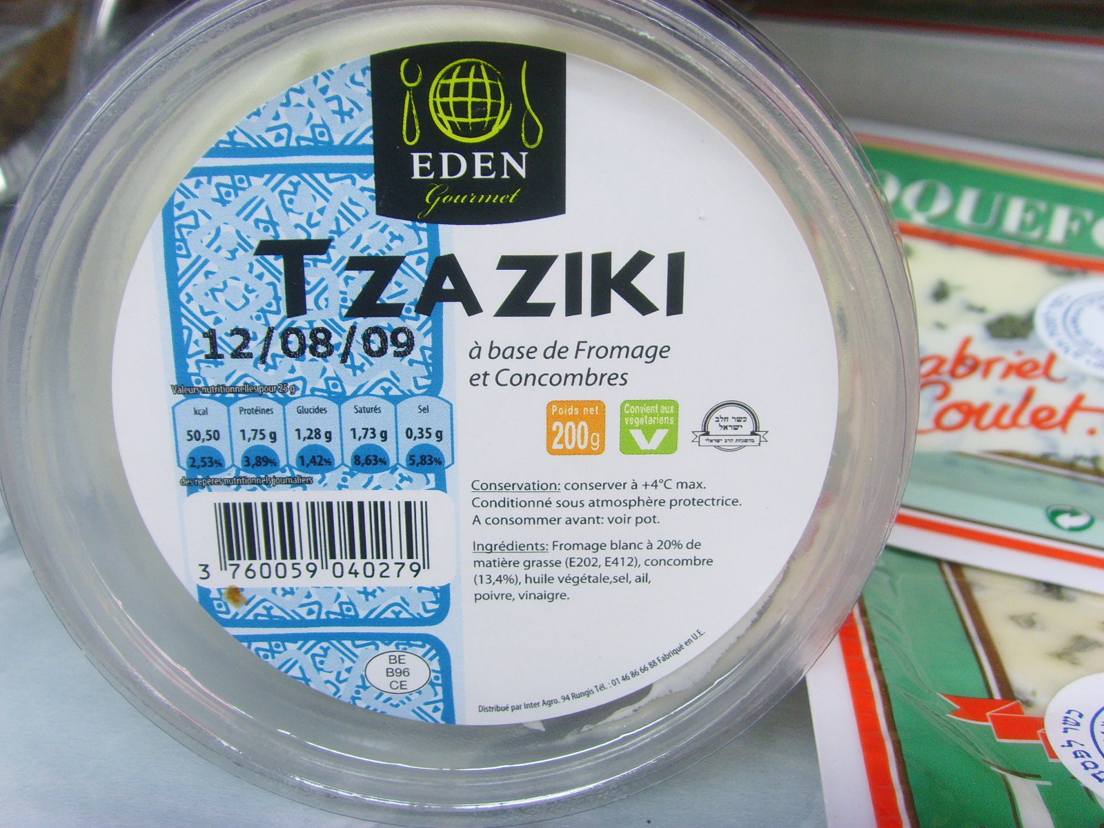 puisse se hasarder à les commettre. En conséquence nous n'osons pas penser que le logo ci joint soit une farce du producteur. Pensez donc! Un délicieux fromage grec dit Tzatziki, au concombre, produit par "Eden Gourmet" commercialisé par Interagro, garanti "Halav Israël" par le Rav Israéli. |