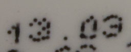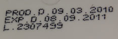 Ou encore un produit semblant être daté du 13.03.2010 avec des anomalies de lecture sur le 3 du 13 pouvant laisser planer un doute. Il se périme le 12.09.2011 soit 18 mois jour pour jour plus tard. | ![]() |