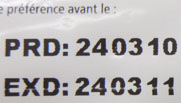 La date de fabrication n'y est pas toujours mentionnée. Lorsqu'elle l'est, cela peut être en clair (jour/mois/année), cela peut être par mention du jour de fabrication décompté à partir du premier jour de l'année, cela peut aussi être masqué dans un numéro de lot (qui ne permet qu'au fabricant –ou à des initiés que nous ne sommes pas- de retrouver la date de fabrication), souvent assorti de l'heure de fabrication. | ![]() |