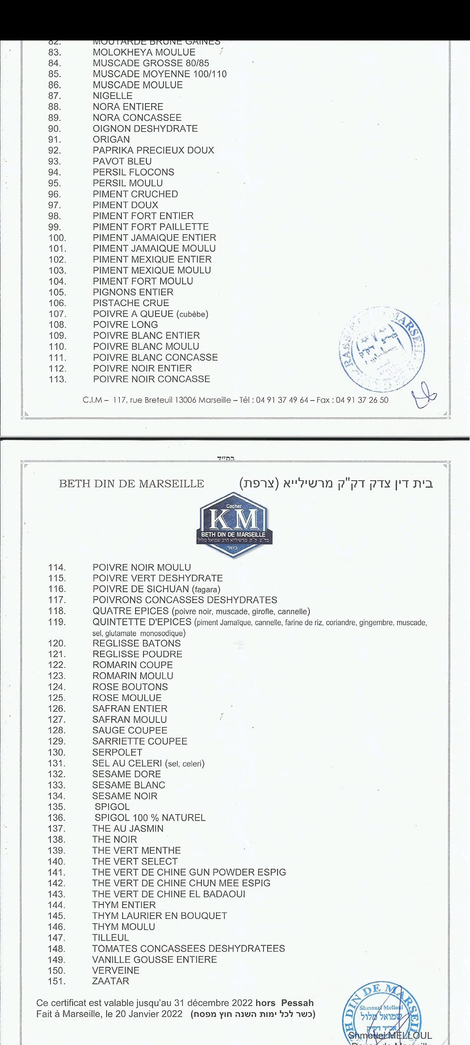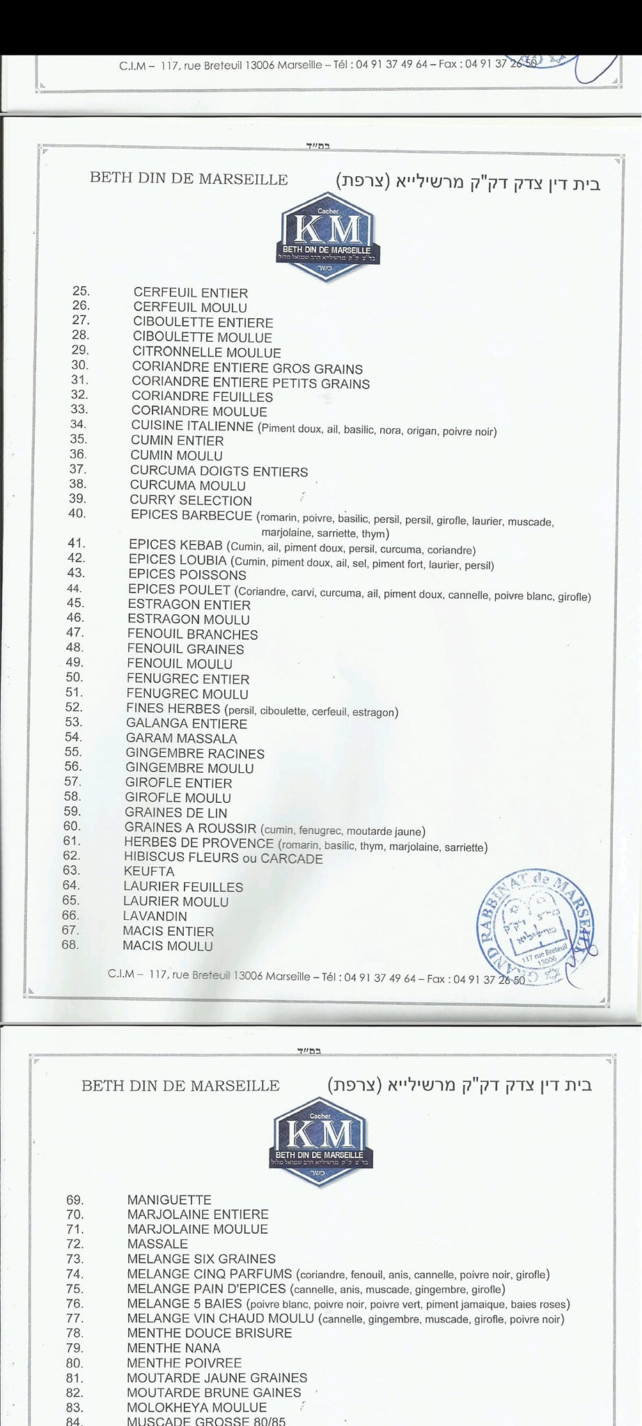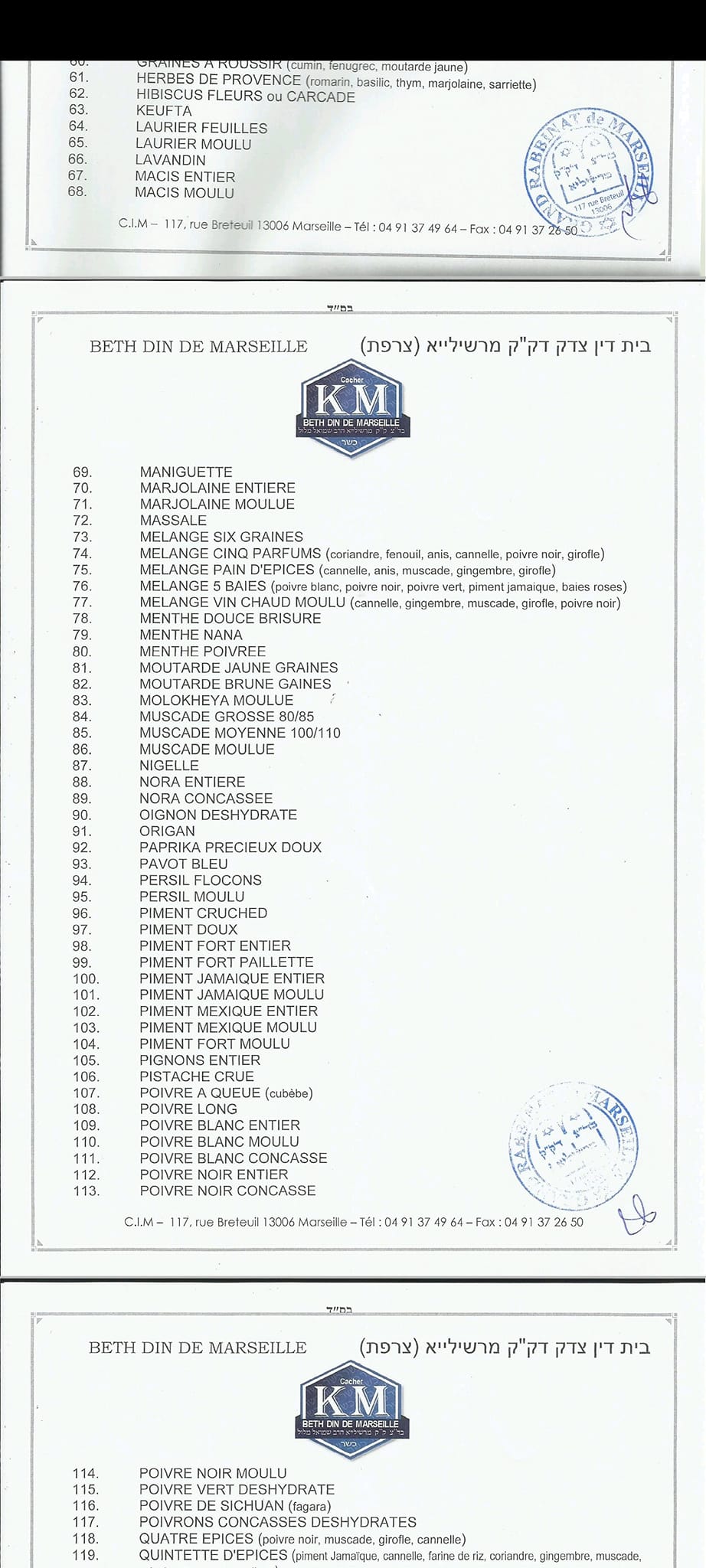 Herbes et épices CEBASCO 2022, Beth Din de Marseille 1 2 3 4Huiles Lesieur ---- Alpro et Provamel 2021 --- Confiserie Fabbri ---- Red Bull 2017 Red Bull light2016 ---- Ricola 2021 ---- Panda --- Marrons glacés Corsiglia ---- Agrimontana ---- Epices Indasia ---- ---- Dragées Adam ---- Boissons Celtic ---- Heinz 2022_ 1_2 ---