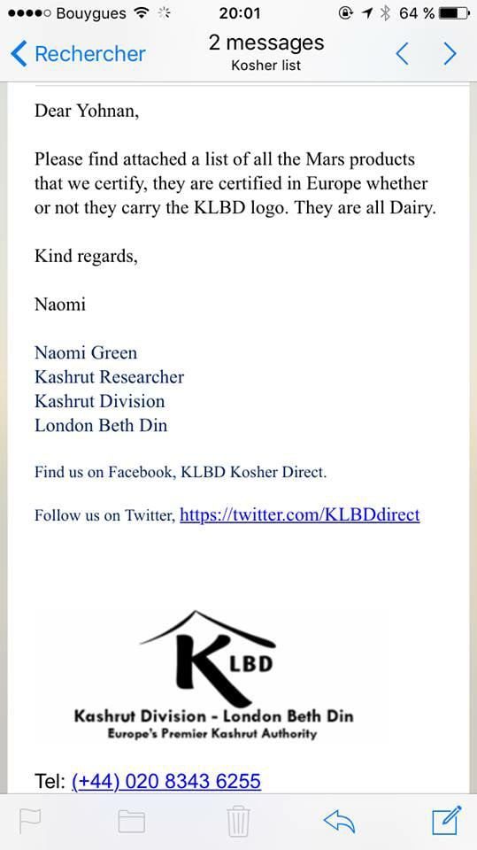 Produits Masterfood (Mars, Bounty etc...): 1 2 3 http://isitkosher.uk/#mars%20confectionery. -- 2022 arrive...