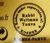 jours du grand jour. Suite à des remarques de lecteurs, nous sommes partis voir de nous mêmedans un Magasin Leclerc de la région parisienne, où un rayon cacher bien achalandé avait deja proposé des produits non conformes l'an dernier. Mêmes causes, même conséquences. Un certain npombre de produits de la Maison C. , (usuelle des labels infra millimétriques, et qui n'a jamais daigné répondre à nos remarques) était en rayon. Il faut dire qu'avec des mentions de taille inférieure à 1 millimètre, il est difficile à Madame Tout le monde de déchiffrer un label de cacherout. |